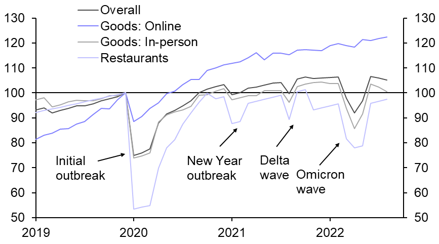 Consumption is likely to be even weaker in September. Virus disruptions intensified at the start of the month, with many cities entering new lockdowns. Spending on high-contact services such as retail and leisure will have suffered as a result. And while there are tentative signs that the worst of the recent COVID wave has passed – nationwide infection numbers have fallen from a peak of 3,500 in mid-August to below 1,000 at the time of writing – intra-province travel restrictions will remain in place until the end of October. This covers the ‘Golden Week’ National Holiday in the first week of October and will limit the scope for an immediate rebound in spending as the wave of infections subsides.
