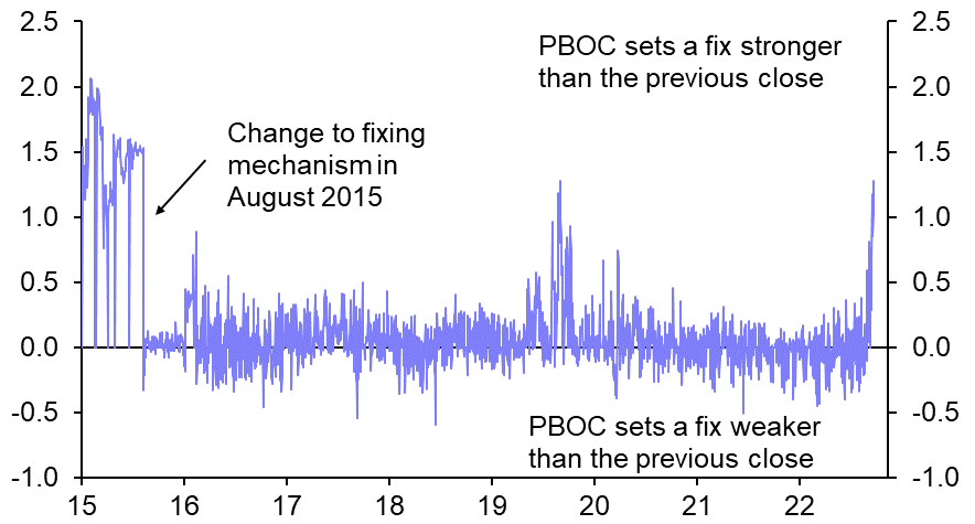 In the face of a surging dollar, the People’s Bank of China is battling to prevent the renminbi from going much beyond 7/$. Today it announced a hike to the reserve ratio for currency forwards, a move to deter speculation against the renminbi. The central bank has also been pushing back by setting the mid-point of the currency’s trading band at an unusually large mark-up to the spot. (See Chart 3.) There’s nothing sacrosanct about 7/$, but it’s the line in the sand that policymakers appear to have drawn amid concerns that an overt weakening of the currency could encourage capital outflows, which would in turn risk destabilising the domestic financial system.