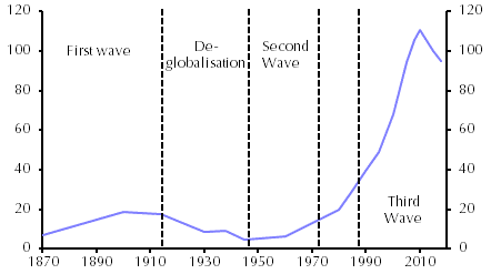 In some respects, the period of globalisation that fundamentally reshaped the world economy during the 1990s and 2000s was nothing new. In fact, the world has experienced three waves of globalisation over the past 150 years. The first ran from 1870 to 1914. During this period, a combination of tariff reduction and new technologies (in particular the growing use of steam-powered ships) led to a surge in global trade. In the four decades from 1870, global goods exports rose from 5% to 10% of world GDP. (See Chart 1.)