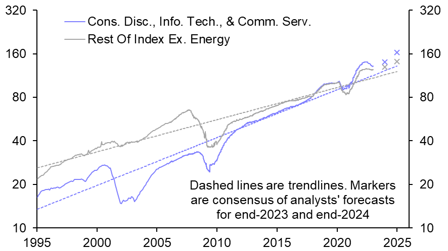 • Point 1: Although expectations for earnings have been pared back considerably, they remain above trend. A surge in S&P 500 forward 12m (FTM) earnings per share (EPS) drove the index up in 2021 and cushioned the blow from the big “de-rating” it experienced in H1 2022 as TIPS yields soared. Since then, though, FTM EPS have declined by about 4%, based on I/B/E/S survey data. (See Chart 1.) The pull-back has been more pronounced in a “supersector” containing the “growth-heavy”, “rate-sensitive” consumer discretionary, information technology, and communication services sectors. This supersector contains the big-tech behemoths which prospered in general during the pandemic. FTM EPS have also fallen on average to a lesser degree in other sectors. One sector that had bucked the trend until recently was energy. But FTM EPS in this sector have also finally rolled over in the wake of falling energy prices. (See Chart 2.)