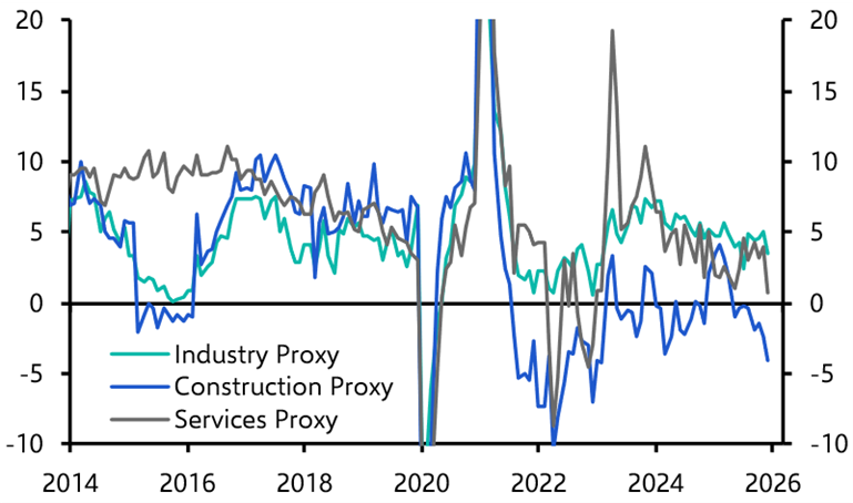 The main fly in the ointment is China. Admittedly, the labour market data are showing some signs of improvement. But structural headwinds persist. Our China Activity Proxy points to growth of under 3% y/y in Q4. Construction appears to have contracted by around 2.5% y/y, reflecting the continuing downturn in the property sector. Meanwhile, services and manufacturing expanded by around 2.5% y/y and 4.5% y/y respectively. (See Chart 5.)