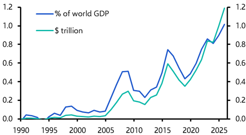 Some degree of imbalance is normal; the goal is not perfectly balanced trade, but sustainability. The problem is that China’s large surplus requires that other countries accumulate large amounts of external liabilities, while at the same time accepting that domestic producers will be continually squeezed by their Chinese counterparts. For now, these imbalances do not seem to have reached a point where they pose an immediate threat to the global outlook. The borrowing in deficit countries is being done primarily by the public rather than the private sector and, for the time being, sovereign bond markets do not seem unduly concerned. If economic growth falters in the near term, more likely triggers would be a sharper-than-expected slowdown in US hiring that becomes self-reinforcing, or a sudden halt to the AI investment boom. Our base case remains that the global economy continues to hold up through 2026.