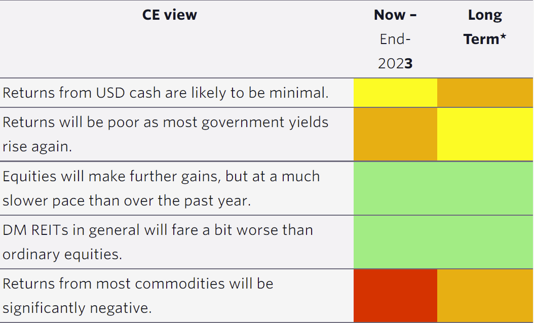 We no longer expect equities and corporate bonds to outperform “safe” government bonds by anything like as much as we did a couple of quarters ago, and we continue to forecast that some other “risky” assets, including most commodities, will struggle over the next couple of years.