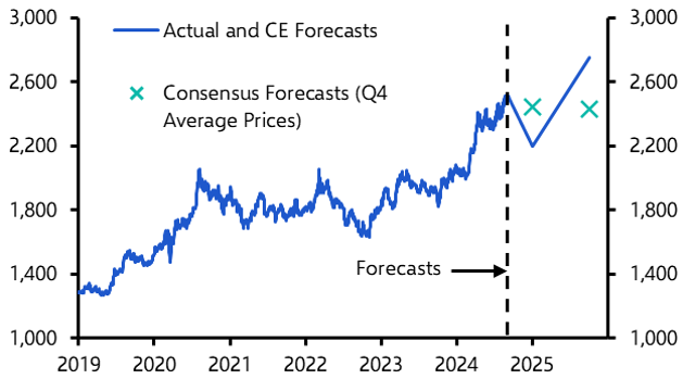 With a long and varied list of supportive drivers to choose from, we have raised our end-2025 gold price forecast to $2,750 per oz. But even though we now forecast gold prices to end next year about 10% higher than their current level, the path between now and then is unlikely to be smooth. In fact, we think it is more likely than not that gold prices will fall, potentially sharply, before rising again.