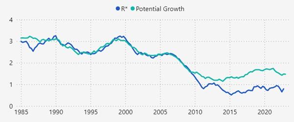 The analytical framework for our r* research, where equilibrium interest rates are determined by the potential rate of GDP growth and other factors which influence the desire to save or invest.