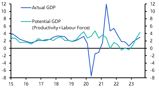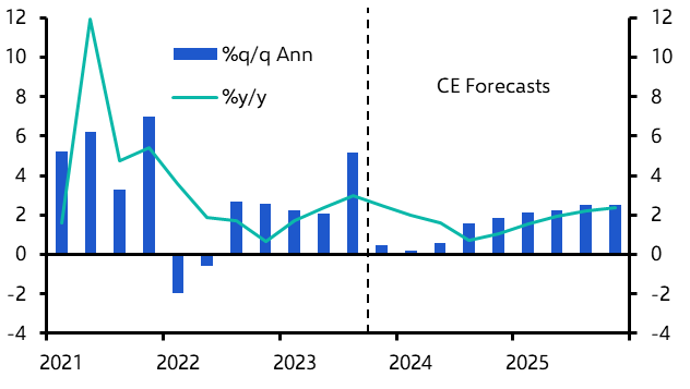 The lagged impact of previous monetary tightening will continue to feed through for the next few quarters, however, pushing GDP growth well below potential. But we expect the economy to narrowly avoid a recession, and rate cuts should fuel a pick-up in GDP growth starting in the second half of next year.