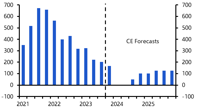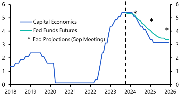 - With core inflation rapidly normalising and monetary policy likely to be a little impotent on the way down too, we anticipate that the Fed will have to cut interest rates more aggressively than markets currently believe. (See Chart 8.) We expect a cumulative 175bp in cuts in 2024 with a final 50bp coming in early 2025. With inflation returning to the 2% target by mid-2024, however, even the aggressive policy loosening that we envisage would still leave the real rate at 1%.