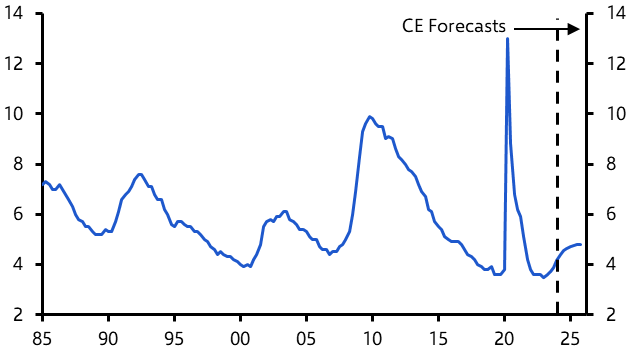 - The downward trend in employment growth will continue, with non-farm payrolls likely to stagnate over the coming quarters. Alongside the recent resurgence in the labour force, that means the unemployment rate should continue to edge higher and put further downward pressure on wage growth. Slowing GDP growth combined with still-robust labour force growth should push the unemployment rate up to almost 5%. (See Chart 3.)
