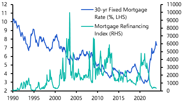 - Moreover, that low-rate legacy debt could end up being a double-edged sword because it means that, as the Fed begins to cut rates next year, we won’t see the usual surge in refinancing. (See Chart 5.) In other words, monetary policy will have lost some of its potency on the way down as well as the way up. With the underlying Federal budget deficit rebounding to around 7.5% of GDP over the past 12 months, there would appear to be little prospect of any fiscal stimulus next year either to supplement monetary loosening.