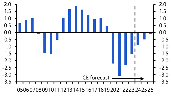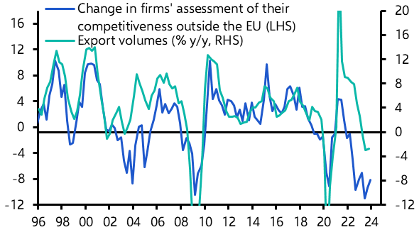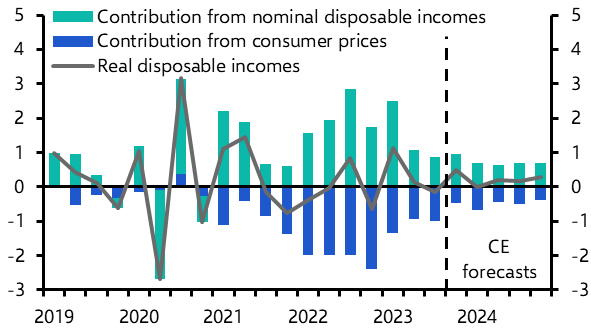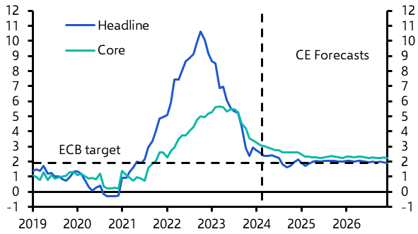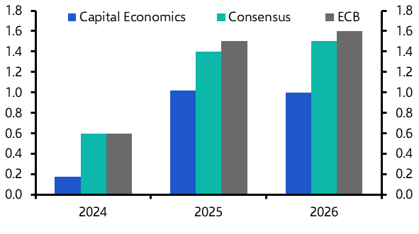 Euro-zone household real incomes will pick up only slowly and consumers will be cautious amid a softening labour market. Moreover, we expect business investment to stagnate due to soft domestic and foreign demand, and governments will tighten fiscal policy further. With inflation on track to reach its target in the second half of the year, the ECB will cut its deposit rate from 4% to 3% by year-end and to around 2.25% by the middle of 2025. While this should help to support activity next year, the effect of rate cuts will feed through only gradually so the boost to growth will be small.