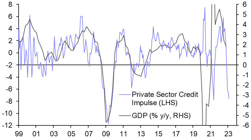 - After stagnating in Q4, GDP probably increased slightly in Q1 so the euro-zone avoided a recession over the winter. But while the business surveys have held up fairly well recently, the money and credit data have been extremely weak. (See Chart 1.) We think things will get worse as the impact of higher interest rates intensifies and banks prioritise stability over growth.