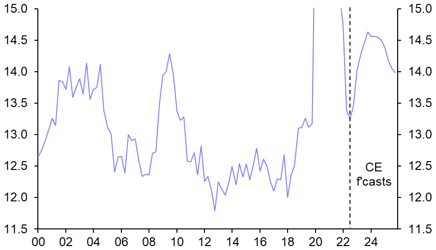 - After accounting for rising interest expenditure, households’ real disposable incomes are set to fall further this year than they did last year. Higher interest rates will also weigh on spending power in 2024. And the low level of confidence suggests that they may save a larger share of their incomes too. (See Chart 2.)