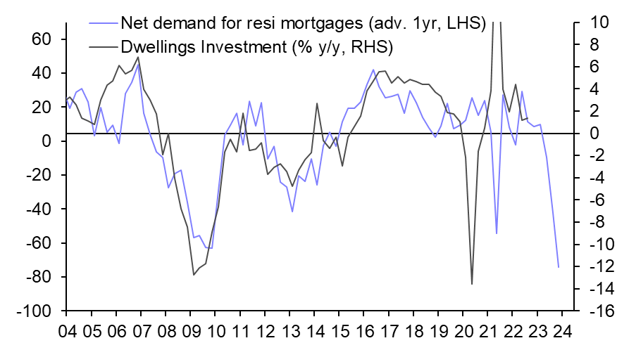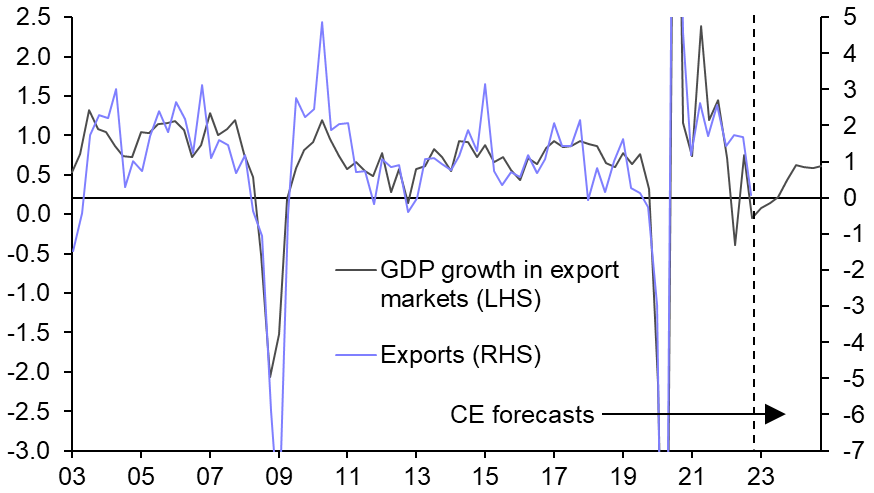 - Investment is also likely to fall, with the latest data on mortgage demand pointing to huge declines in residential investment (see Chart 3) as house prices decline. And export growth will be subdued this year as the global economy enters recession before picking up in 2024. (See Chart 4.)