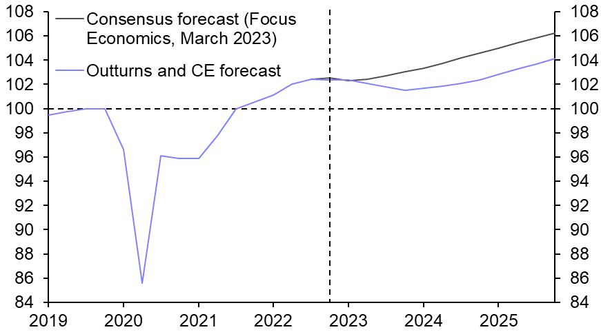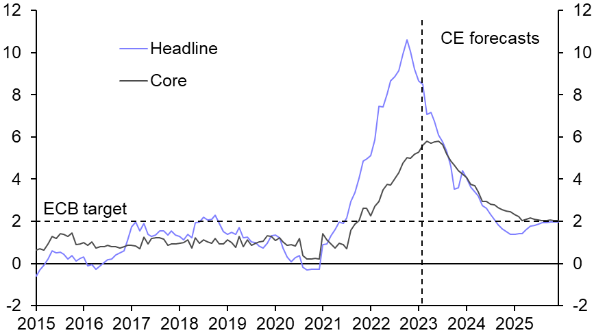 The euro-zone economy is set to perform much worse than consensus forecasts suggest over the next two years, with a recession looking likely. That is mainly because monetary policy and bank lending conditions are tightening. We expect household consumption to decline because, after accounting for rising interest expenditure, disposable incomes will fall. Moreover, the low level of consumer confidence suggests that the saving rate will rise. Investment looks sure to fall too, led by a sharp downturn in the construction sector. Meanwhile, headline inflation will decline sharply as the contribution from past increases in energy and food drop out of the year-on-year rate. But core inflation will come down much more slowly, not least because there will continue to be little or no spare capacity in the labour market. Assuming that the recent turmoil in the banking sector does not escalate, the ECB will raise interest rates further and keep them high for longer than is currently discounted in the markets. That said, once it starts to cut interest rates in 2024, we suspect that it will move faster than most expect.