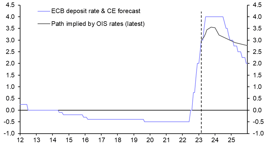 - As a result, we forecast that the ECB will raise its deposit rate to a peak of 4% by the middle of this year. Investors appear to have come round to our view that we won’t see rate cuts until 2024. But once the Bank does start cutting, we suspect that it will move more quickly than investors currently assume, taking the deposit rate to its neutral level of around 2% by the end of 2025. (See Chart 8.)
