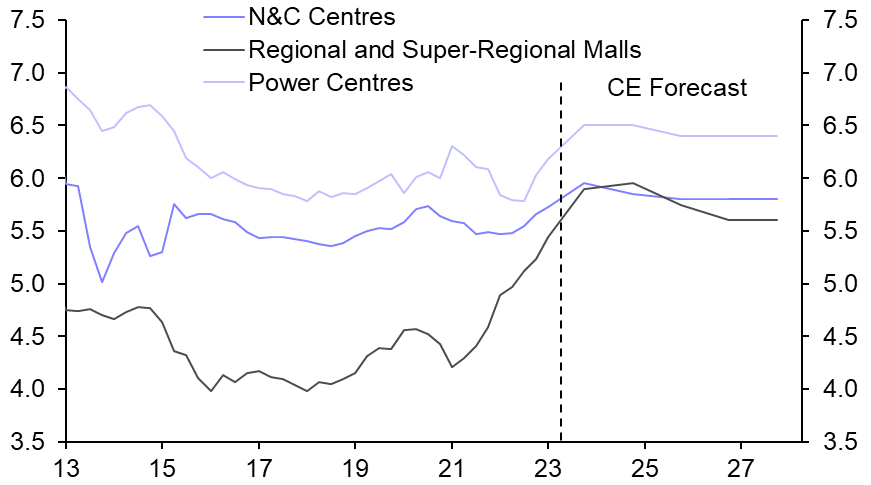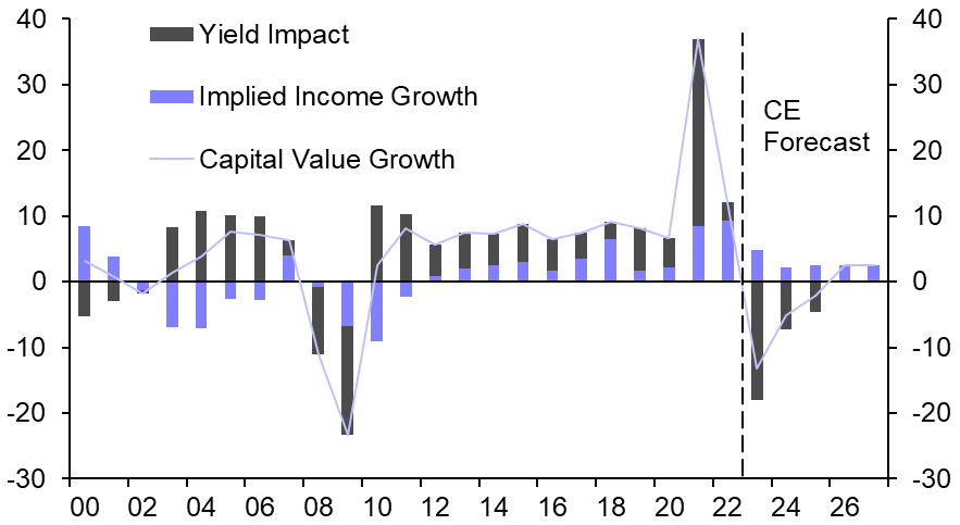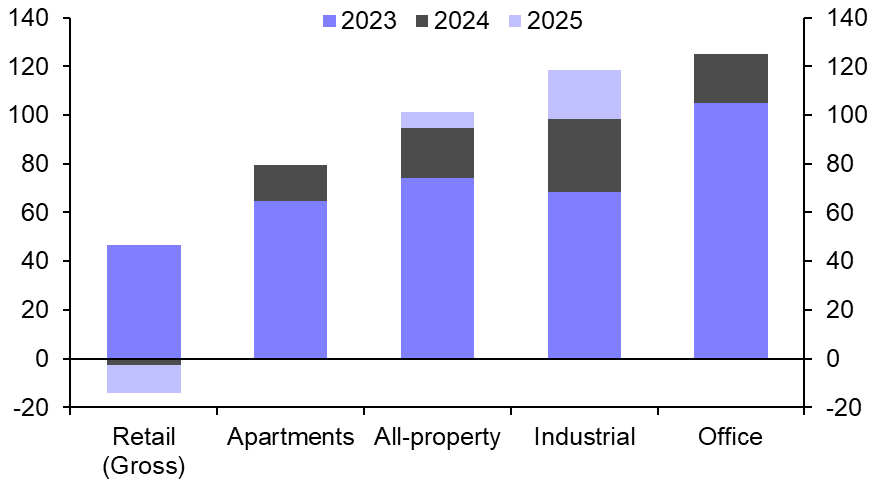 - Distress is growing as firms continue to vacate space (see chart 3.) We expect that to push CMBS delinquency rates higher and for more investors to hand assets back to banks. A further small downgrade to our office forecast this quarter means we now expect a 38% peak-to-trough fall in capital values – and we don’t expect those losses to be recouped even by 2040. Much of this fall is front-loaded this year (see chart 4), with a more-than 100 bps rise in MSCI yields contributing to a hit of over 20% y/y. We expect a combination of further yield rises and falls in operating incomes to keep values declining in 2024-25. As a result, total returns over the 2023-27 period are forecast to average -1% p.a.